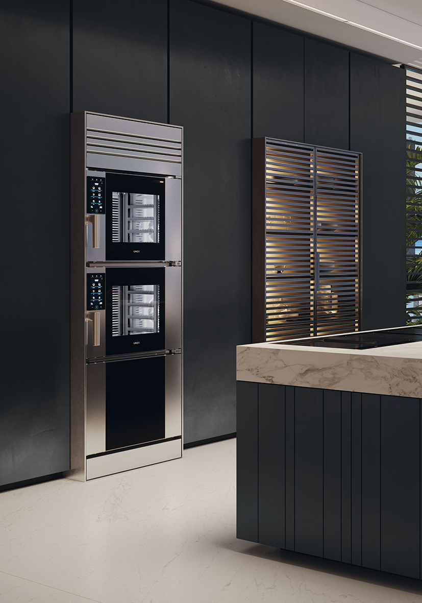 The oven excels in delivering exceptional cooking performance, offering a diverse array of cooking methods, including grilling, frying, smoking, dehydrating, steaming, and sous vide. Notably, the inclusion of humidity sensors enhances cooking efficiency, resulting in consistent and rapid cooking processes, up to three times faster than conventional ovens. The digital interface is user friendly, granting access to a vast library of over 400 automatic cooking programmes that adapt settings based on food quantity, ensuring precision in cooking. The integrated ventilation system features a professional-grade active carbon filter, effectively eliminating odours and vapours. Additionally, the oven incorporates a self-cleaning function that simplifies maintenance, utilising a water-based solution infused with Unox's proprietary eco-friendly detergent. For added convenience, Model 1 includes a sliding accessory drawer that neatly stores professional trays, detergent, and a smoker, enhancing the overall cooking experience.