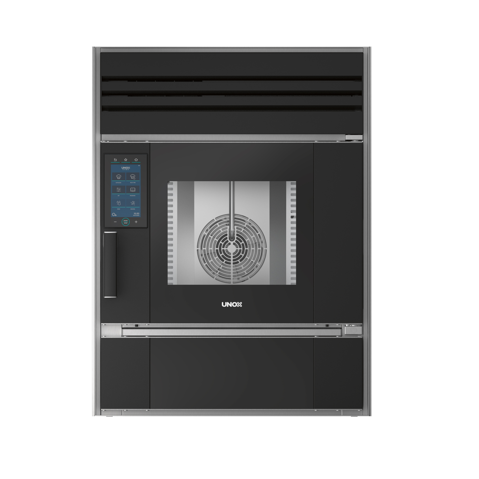 The oven excels in delivering exceptional cooking performance, offering a diverse array of cooking methods, including grilling, frying, smoking, dehydrating, steaming, and sous vide. Notably, the inclusion of humidity sensors enhances cooking efficiency, resulting in consistent and rapid cooking processes, up to three times faster than conventional ovens. The digital interface is user friendly, granting access to a vast library of over 400 automatic cooking programmes that adapt settings based on food quantity, ensuring precision in cooking. The integrated ventilation system features a professional-grade active carbon filter, effectively eliminating odours and vapours. Additionally, the oven incorporates a self-cleaning function that simplifies maintenance, utilising a water-based solution infused with Unox's proprietary eco-friendly detergent. For added convenience, Model 1S includes a sliding accessory drawer that neatly stores professional trays, detergent, and a smoker, enhancing the overall cooking experience.