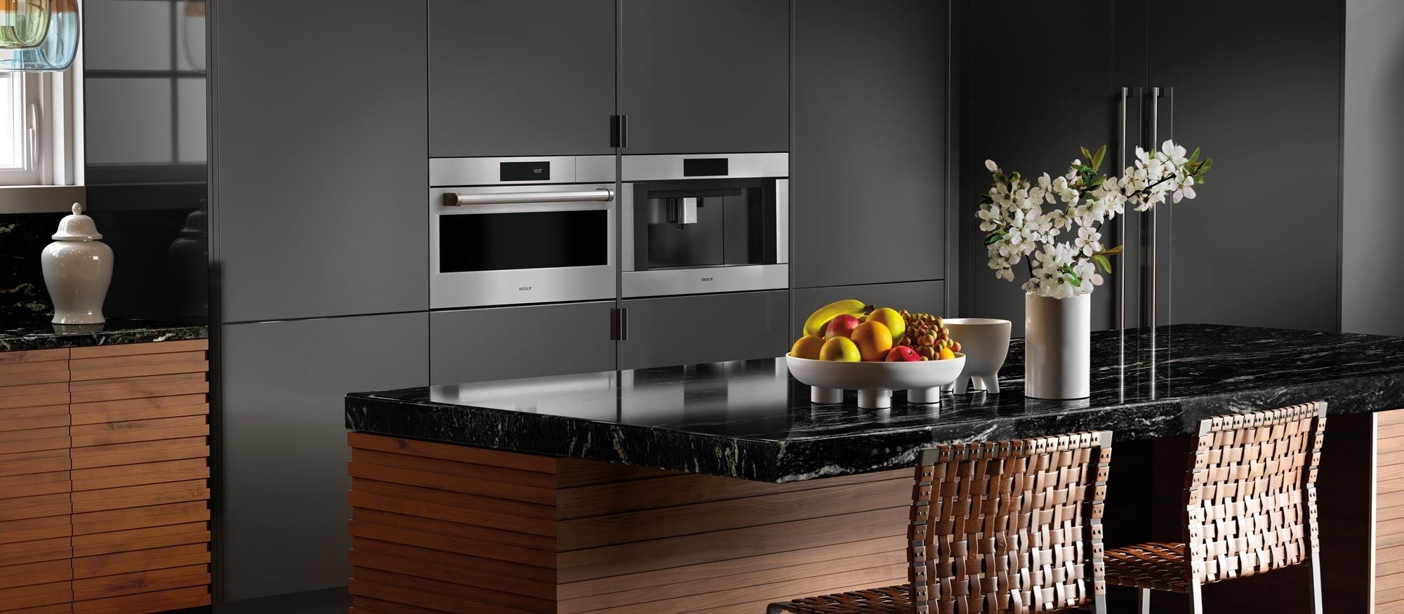 Achieve a cohesive kitchen design by pairing this 30” E series professional steam oven with the Wolf professional gas cooktop and E series built-in oven. The ovens have matching handles and framing and may be installed flush with cabinets for an integrated look.