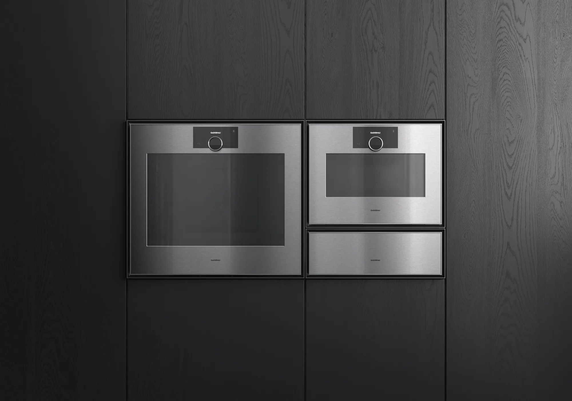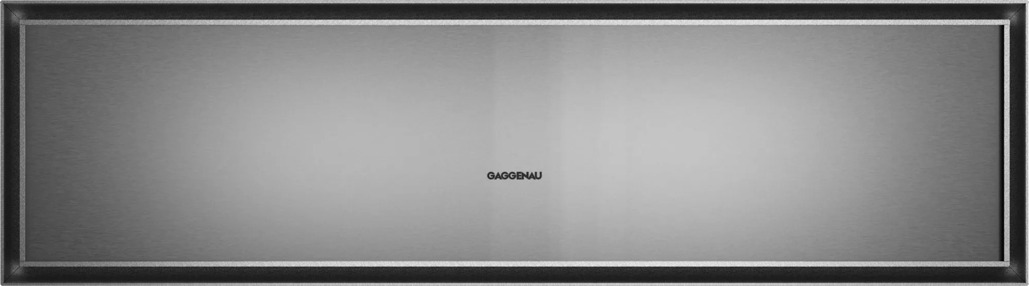 Warming drawer Expressive series, 76cm wide, 21cm high, stainless steel behind smoked grey glass